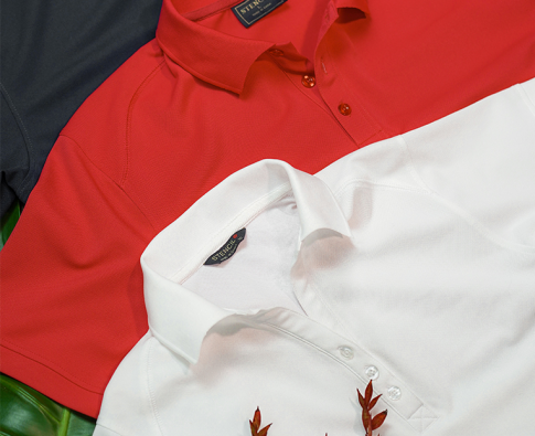 Mens and Ladies short sleeved polo which has unique blend of Sorona and Cool Dry® incorporating ecologically responsible plant-origin fibre. Natural stretch with silken feel, flat knit collar and self-fabric sleeve cuffs. Ladies has open V-neck with three buttons, Mens has three-button placket and loose pocket.