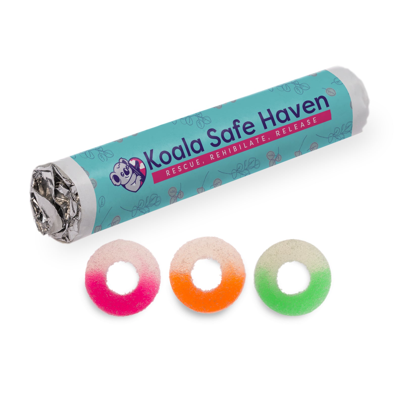 Treat yourself to our delightful Assorted Flavour Fruit Rings, a medley of jelly fruit lollies bursting with flavour. Featuring six tantalizing tastes - Cola, Apple, Grape, Fruit Salad, Orange, and Strawberry. Each roll is individually wrapped in foil to ensure freshness, with a classic white lolly roll for easy enjoyment.