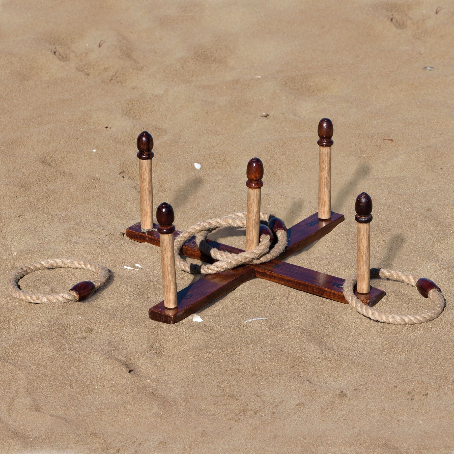 11-pcs Vintage inspired quoits set. Set includes: 2 x Antique natural wood grain interlocking running boards and 5 x wooden stakes with simple fit together system, 4 x natural rope quoit rings.
