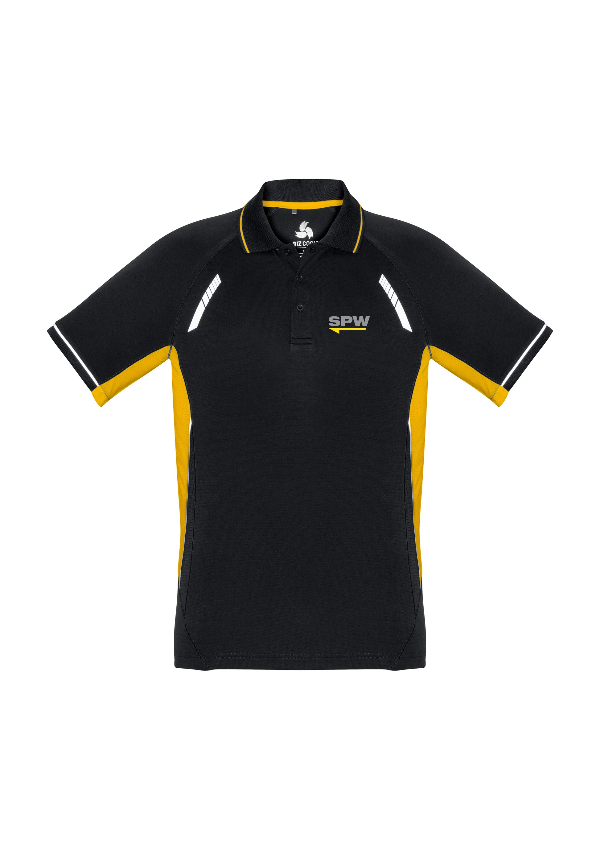 Men's Sports Polo, a performance polo engineered with lightweight, sweat-wicking fabric and silver reflective trims. Contrast gold mesh underarm and sides for added ventilation where you need it most. Made from 100% micro polyester 155 GSM and a UPF Rating of 50+. Embroidered SPW logo on the left chest. This item is made to order please allow 2-3 weeks for delivery.