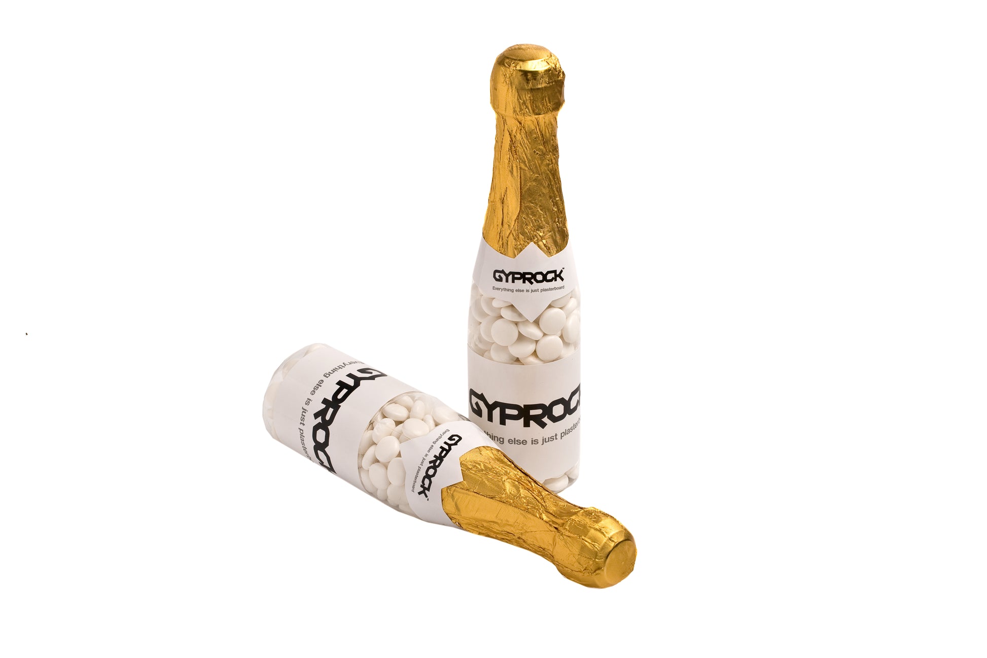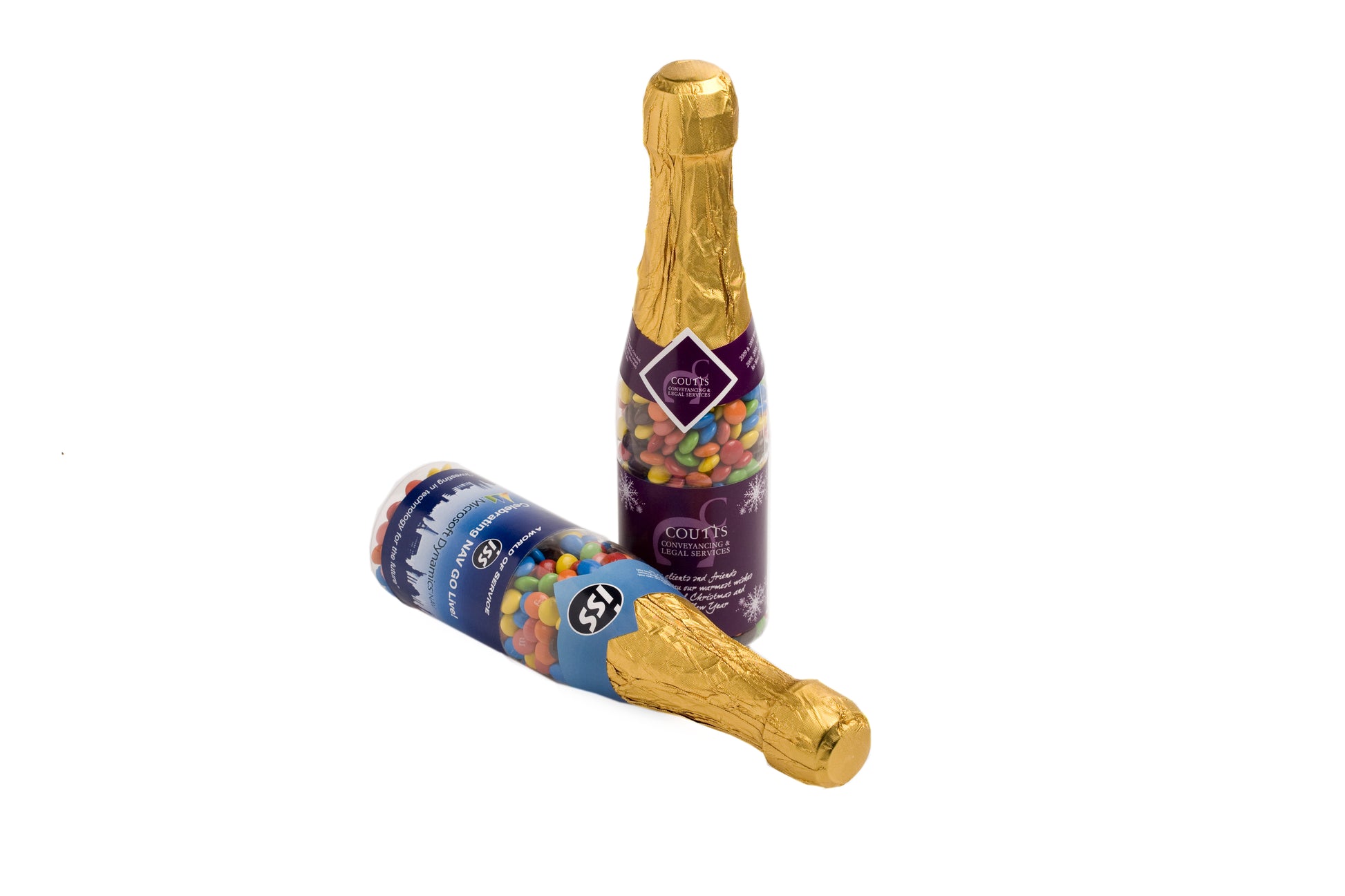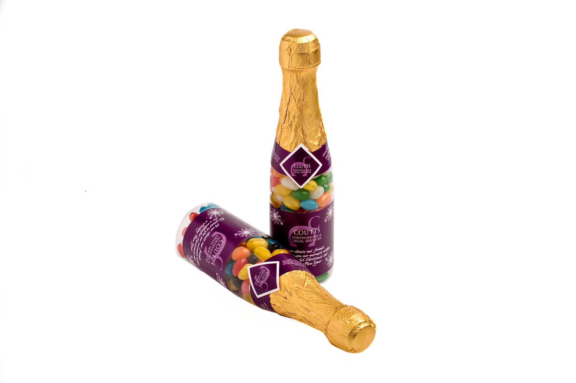 Champagne Bottles filled with 220 grams of Jelly Beans are a fun addition to any business celebration . Either mixed or corporate colours are available. Included is a full colour neck and bottle label and the choice of gold or silver foil wrap.