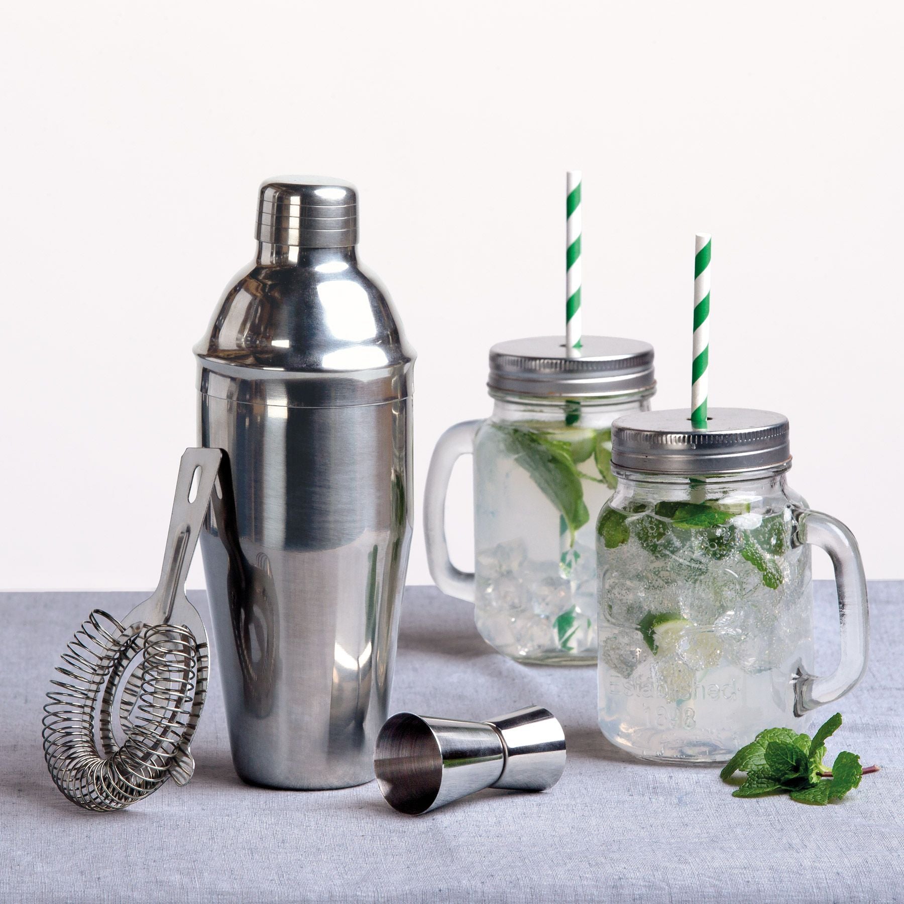 Stainless steel 10 piece cocktail set including 750ml shaker, muddler, separator spoon, 15/30ml double jigger, 2 free flowing nip pourers, ice tongs all to be stored in a velvet pouch and presented in a po di fame presentation tube. Logos can be laser printed on the shaker.