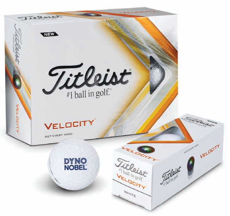 Titleist Velocity golf balls per dozen. Printed DYNO NOBEL logo 1 colour.