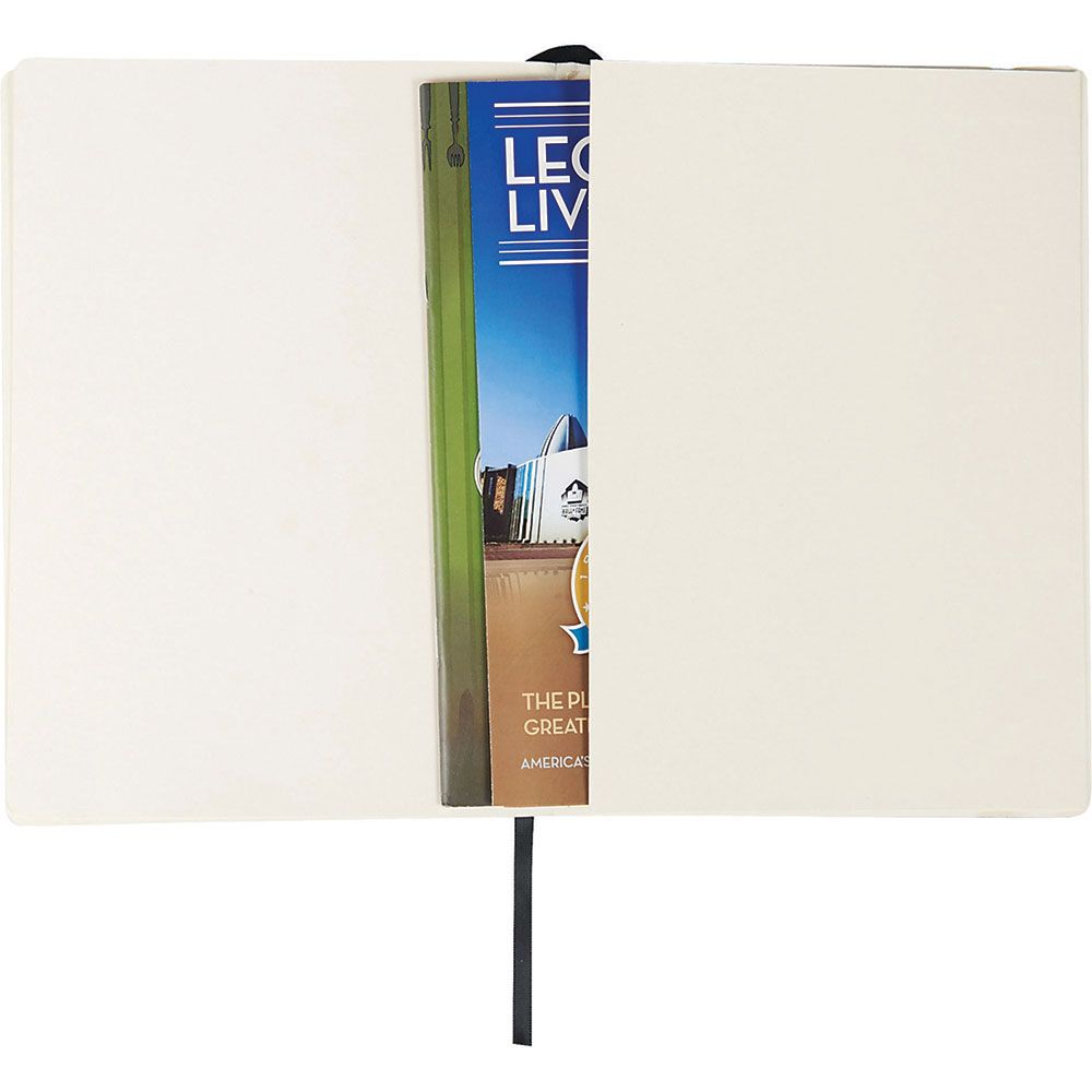 The A5 Pedova journal features a flexible cover with built in elastic closure. Includes 80 pages cream lined paper, ribbon page marker and a document pocket on the interior back cover. Available in 4 tonal colours black, blue, purple and red.