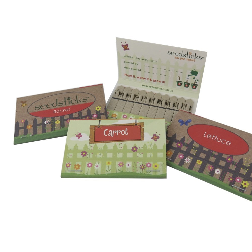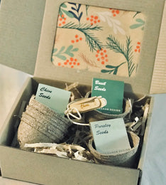 Each box has a card that we custom print for your message or branding visible from the outside when the box is closed, growing instruction are on the reverse of the card visible when the box is opened. Inside there is 3 or 5 peat pots with a compressed peat pellet for each pot, we provide 3 individual 5 stick packs for planting and plant labels. There are opportunities for branding the seed packs and the plant labels if desired.