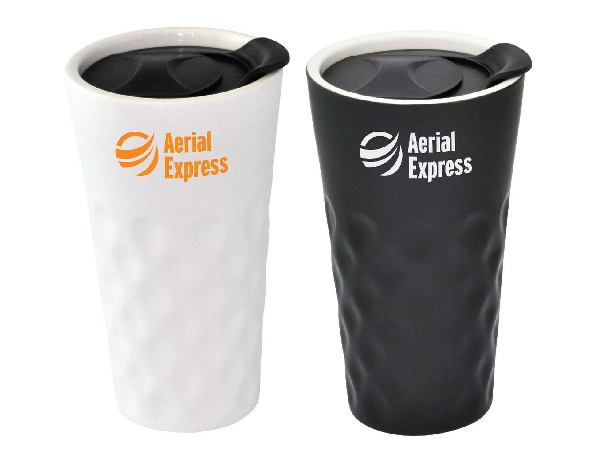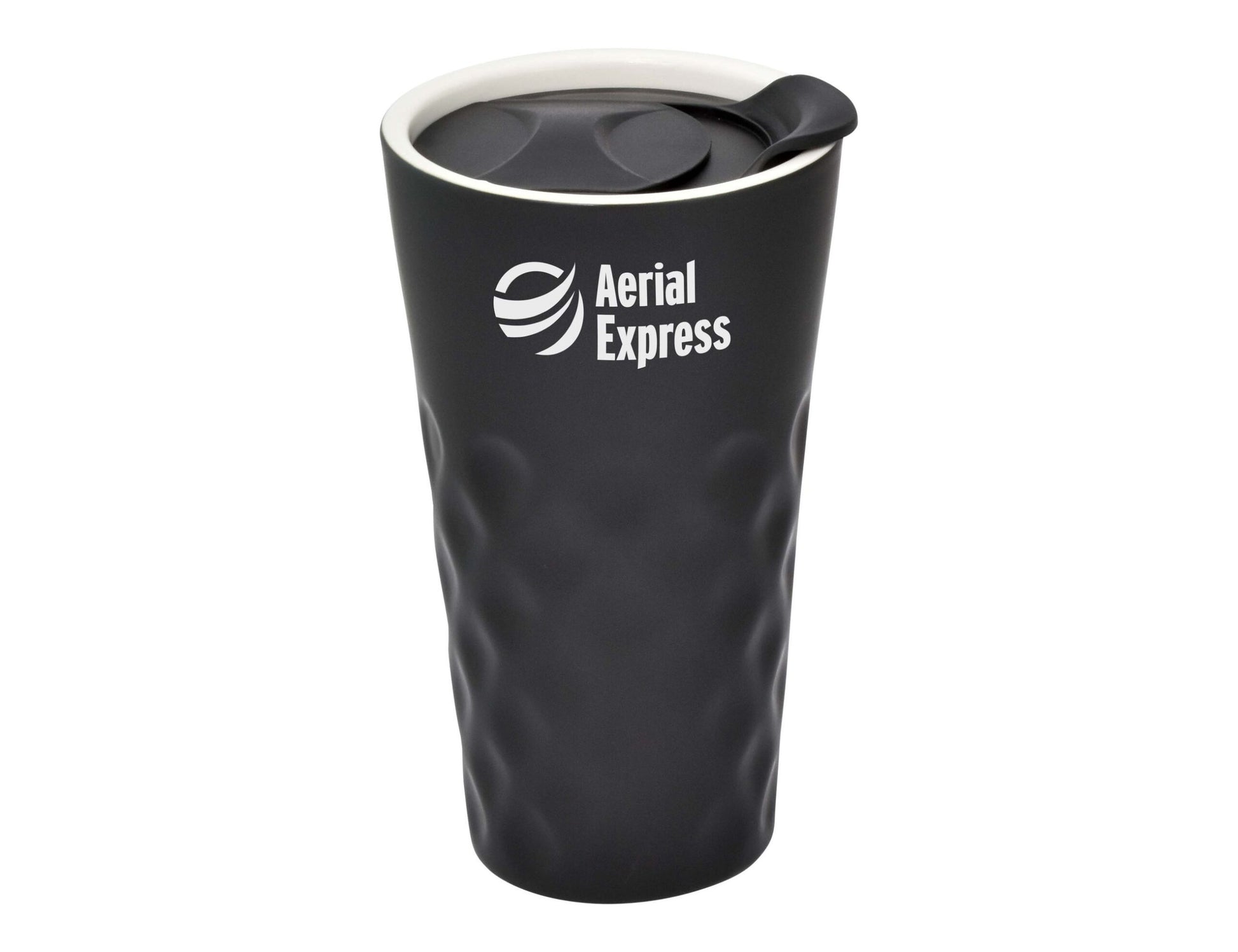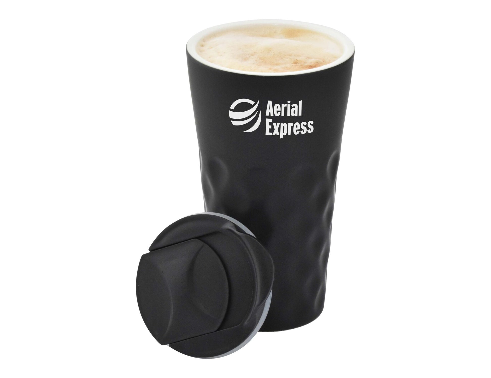 This quality ceramic mug features a double wall construction designed to keep the outside of the mug cool while keeping your coffee extra hot. The distinctive dimple design is pleasing to the eye and comfortable to grip, ensuring this gift will take pride of place on the office desk. Use the included splash proof lid when you are out and about to prevent any nasty spills. This mug is available in matt black or matt white, both with black splash proof lid.